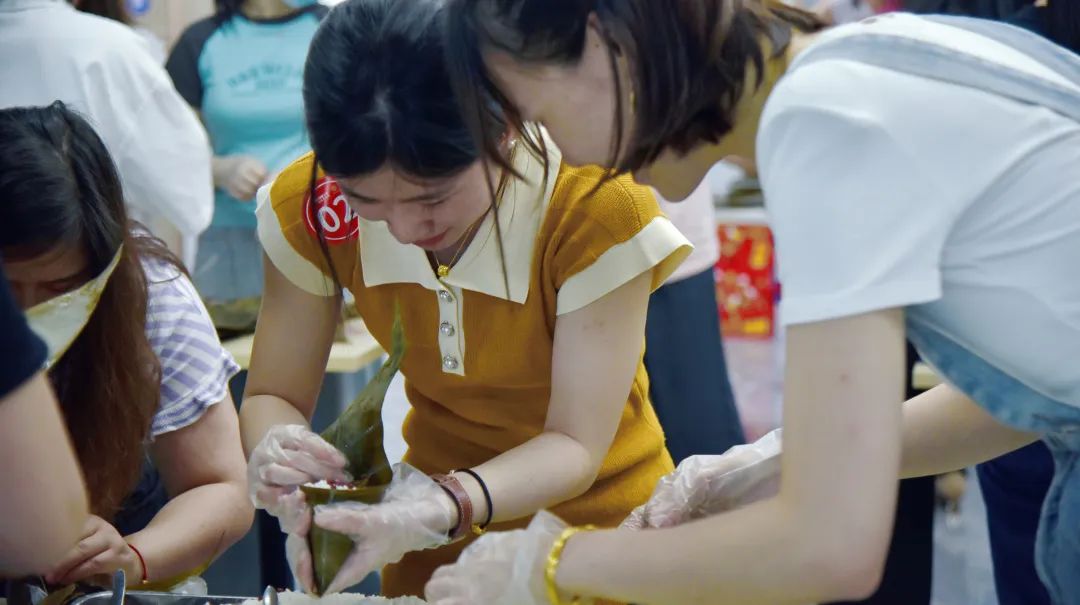 一捧艾葉草,黏甜糯米香。參賽的小伙伴們,圍成一圈,攏葉、加米、綁繩、系結(jié),或是有條不紊,或是手忙腳亂,比賽場(chǎng)上歡聲笑語(yǔ)不絕。
